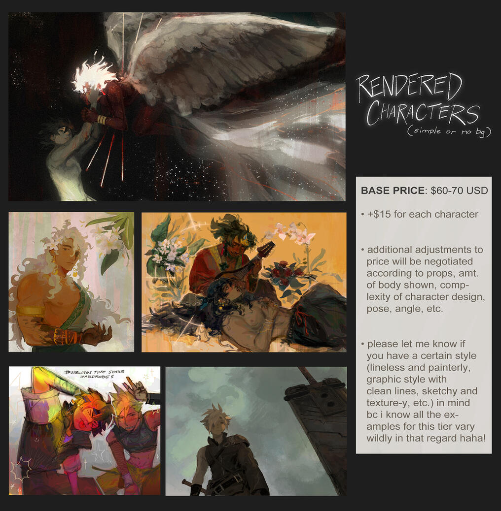 ↳ please do not use any commissions if you were not the one requesting/don't have explicit permission from the client!↳ you may repost the completed work, use it as a profile pic, header, etc. with proper credit. only for personal use, no commercial purposes↳ i might post the finished work on my own social media unless the commissioner has expressed otherwise