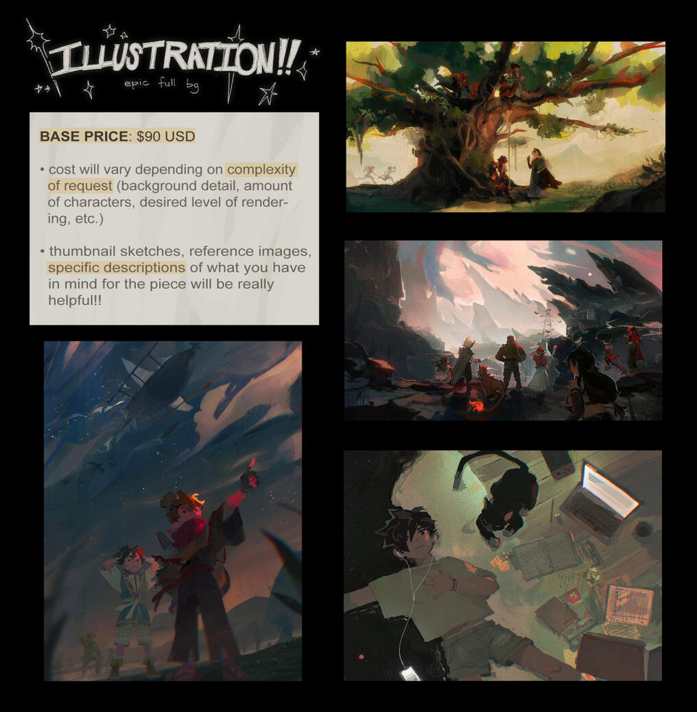 ↳ before starting the commission, any references, specific inspo, or sketches of what you have in mind would be really appreciated! the more detail the better↳ please let me know your preferred method of communication (dm, discord, email) so we can discuss your requests at length. i will also be sending you WIPs as well as the .png of the finished product there.↳ once the general sketch has been finished, i'll send it over and it can be revised as needed. (lmk how frequently you'd like me to share WIP updates after that point!)↳ once the commission has been completed, feel free to request small last-minute color/value/lighting adjustments↳ ⚠️ TRADE OFFER ⚠️ You receive: Completed Commission. I receive: Your gracious contribution to my walletpermissions: